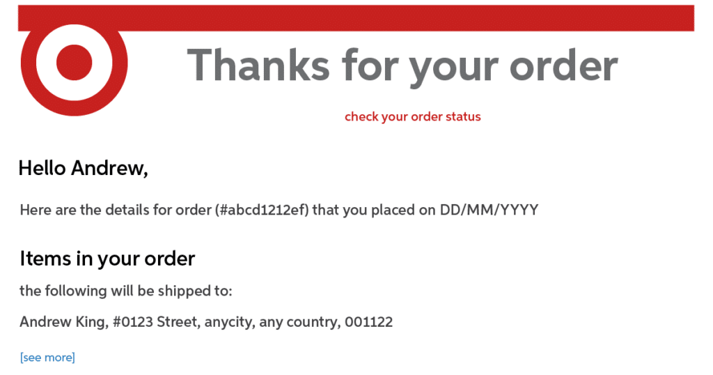 Target: Target’s purchase confirmation emails include a summary of the items purchased, the order number, and the shipping address. They also include a call to action to track the shipment, a reminder of Target’s return policy, and a link to the customer’s account for order details.
