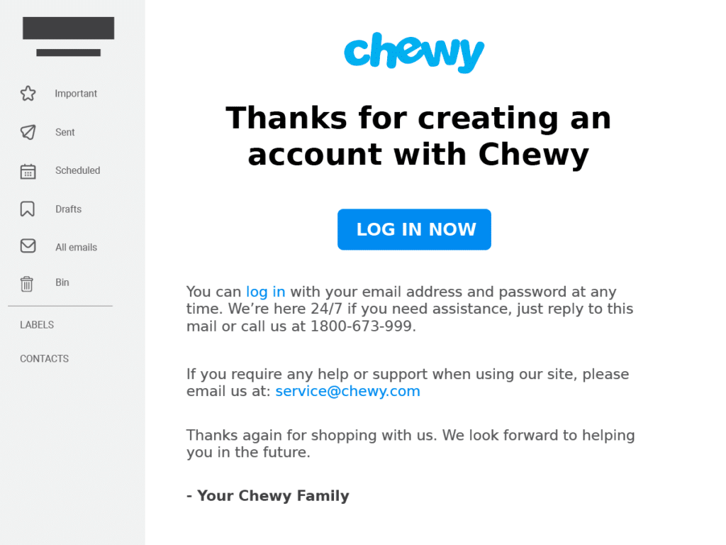 Chewy: Chewy’s purchase confirmation emails provide a summary of the items purchased, the order number, and the shipping address. They also include a reminder of Chewy’s return policy, a call to action to track the shipment, and a promotional offer for future purchases.