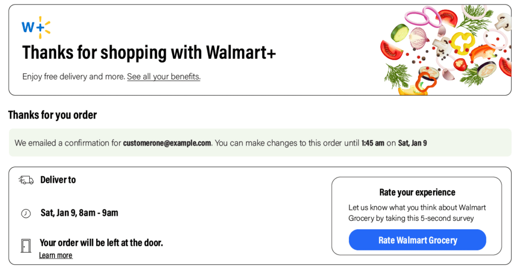 Walmart: Walmart’s purchase confirmation emails include a summary of the items purchased, the order number, and the shipping address. They also include a call to action to track the shipment, a reminder of Walmart’s return policy, and a link to the customer’s account for order details.