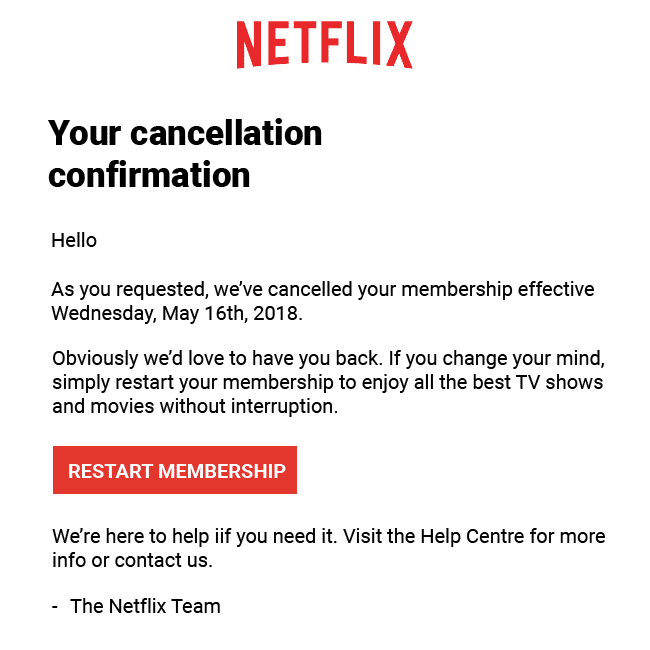 Netflix: Netflix is a subscription-based streaming service for movies and TV shows. Their subscription confirmation email provides new subscribers with instructions on how to set up their accounts and start streaming content. The email also includes a link to their Help Center, where subscribers can find answers to frequently asked questions.