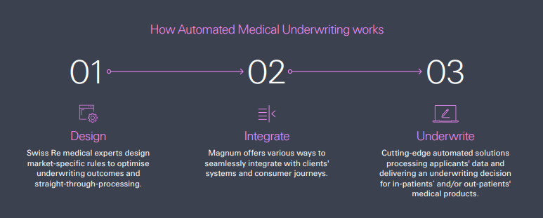 Swiss Re offers numerous underwriting solutions, each designed to meet specific needs, with Magnum being their front runner with its modular platform, data insights capabilities, and innovative edge. Magnum was recognized as an innovative leader among life insurance underwriting engines by the esteemed The Forrester Wave™ Automated Life Insurance Underwriting Engines Q2-2021 report.