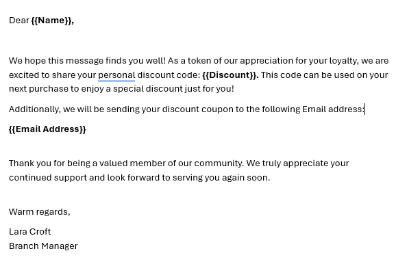 # Build context dictionary: {"Name": ..., "Discount": ..., "Email": ...}